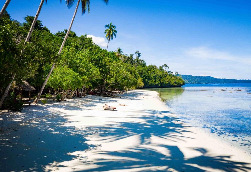 Raja Ampat Biodiversity Nature Resort: Weißer Sandstrand mit Sonnenliegen